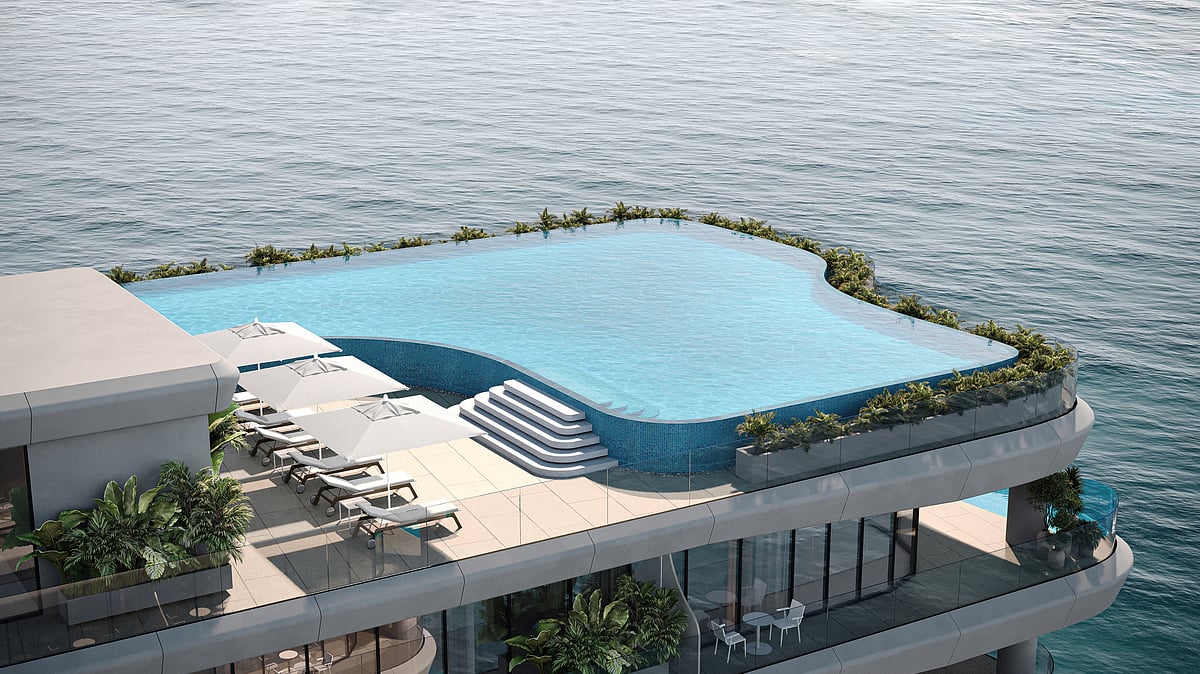 The project’s signature U-shaped architectural form frames the water from almost every angle. Floor-to-ceiling glazing provides every apartment with open sea views, while selected units feature private terrace pools that extend the living space directly towards the horizon. Every layout, from compact studios to 4-bedroom duplexes featuring two pool terraces, has been designed around light, flow, and connection to the surrounding water, ensuring that even the most efficient footprints feel open and resort-like.