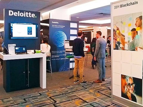 Display stands at the event included a Deloitte product of three screens that employs blockchain for cybersecurity, and an application from start-up Riddle & Code that authenticates expensive watches.