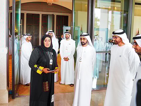His Highness Shaikh Mohammad Bin Rashid Al Maktoum, Vice-President and Prime Minister of the UAE and Ruler of Dubai, and His Highness Shaikh Mohammad Bin Zayed Al Nahyan, Crown Prince of Abu Dhabi and Deputy Supreme Commander of the UAE Armed Forces, were briefed on the new model of government services