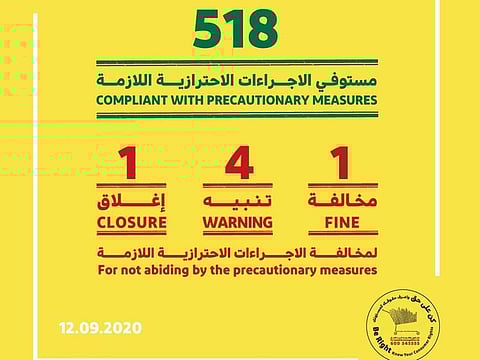The inspections conducted on Saturday found that 518 shops and commercial establishments fully complied with the precautionary guidelines. Dubai Economy stressed the need for everyone to adhere to the precautionary measures in order to protect public health and to ensure business continuity.