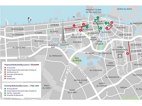 Previously, RTA opened dedicated bus lanes extending 7km. This included a combined bus and taxi lane spanning 4.3km on Khalid Bin Al Waleed Road, from the intersection with Al Mina Street to just before its junction with Zaabeel Street, in both directions. Additional lanes were added along parts of Naif Street (1km), Sheikh Sabah Al Ahmad Al Jaber Al Sabah Street (1.2km from Satwa Roundabout to Sheikh Rashid Road), and Al Ghubaiba Road(0.5 km from the intersection with Al Mina Street to Street No.12).