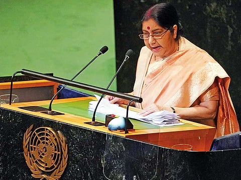 Speaking in Hindi at the UN General Assembly, Sushma Swaraj said: “The demon of terrorism now stalks the world, at a faster pace somewhere, a slower pace elsewhere, but life-threatening everywhere,”