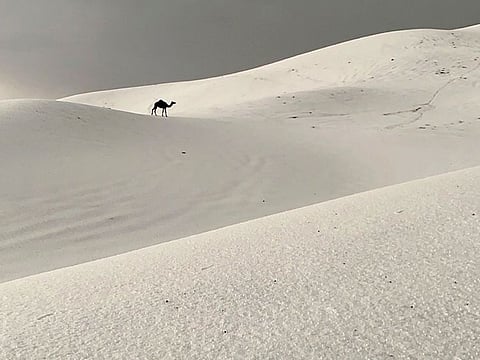 A twitter user shared a video in Asir showing hailstones covering vast areas of sand while a camel was seen walking on a white landscape in the desert.