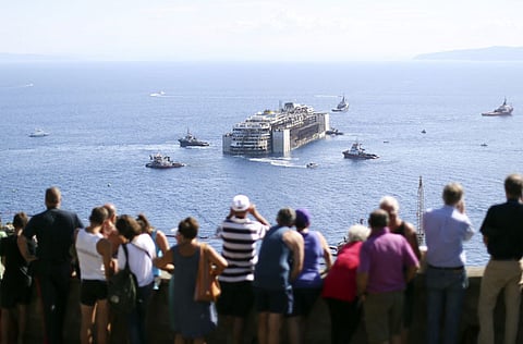 In what ship owner Costa Crociere estimates is a billion-euro (Dh4.9 billion) salvage operation — excluding the cost of its disposal — the Costa Concordia was being towed by Dutch- and Vanuatu-flagged boats while the flotilla carries divers, engineers, a medical team and environmental experts with it.